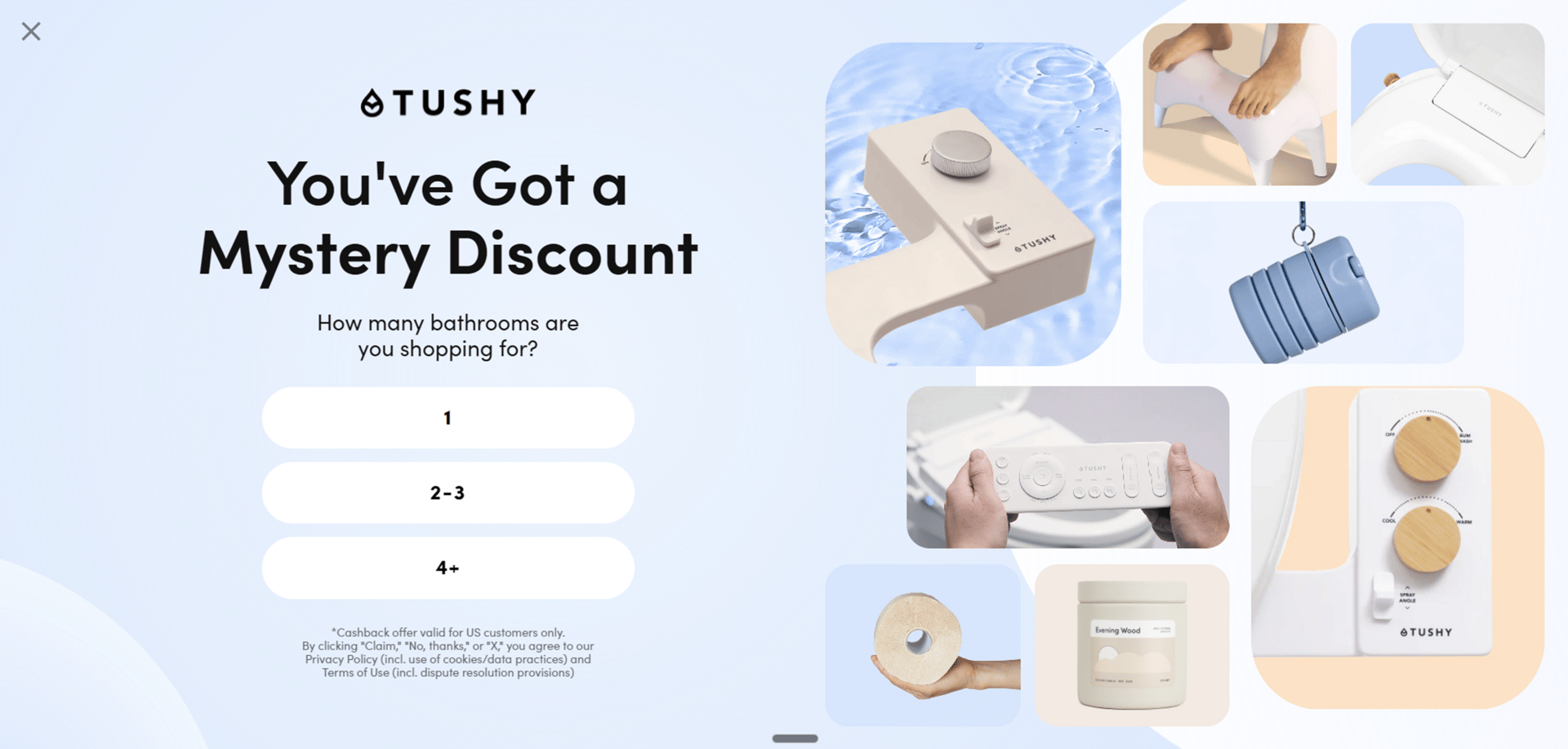 This popup allows Tushy to learn about their customers, then serve them relevant offers based on their household size.