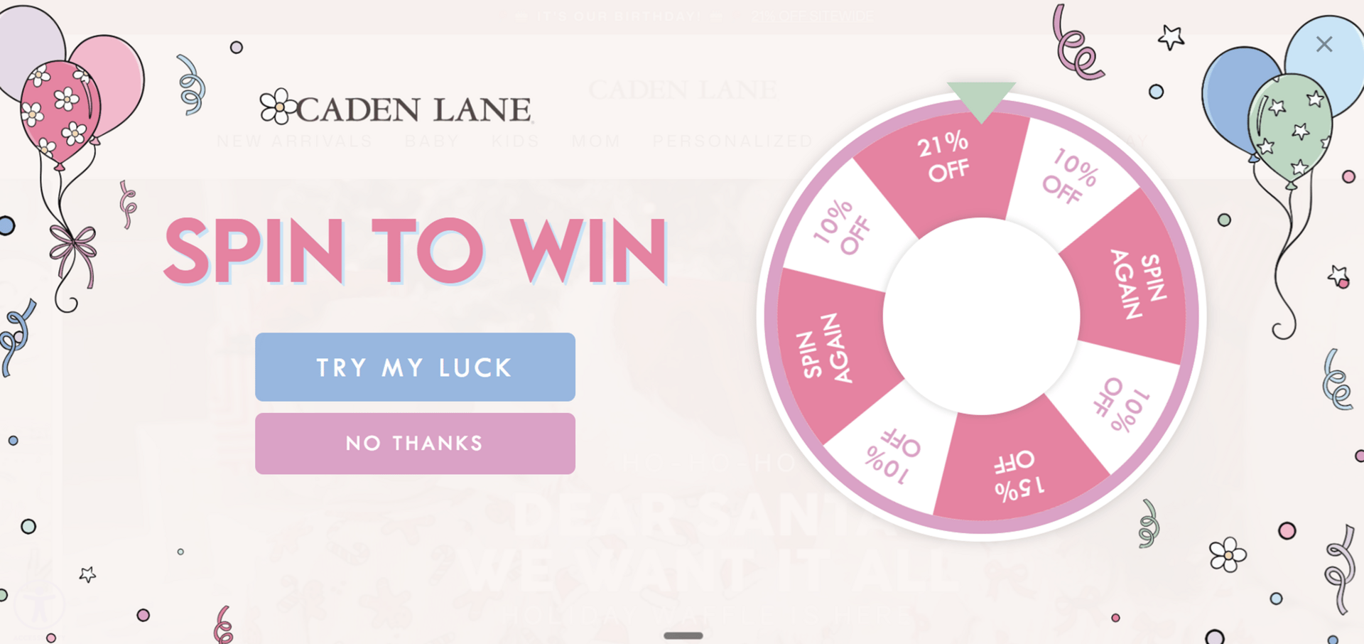 Caden Lane demonstrates this by layering their branding on top of the classic spin popup elements.