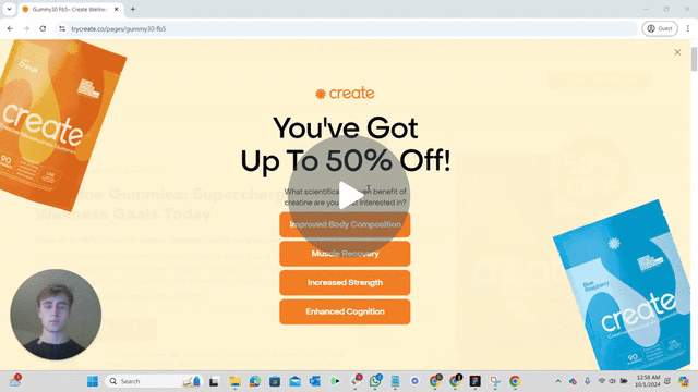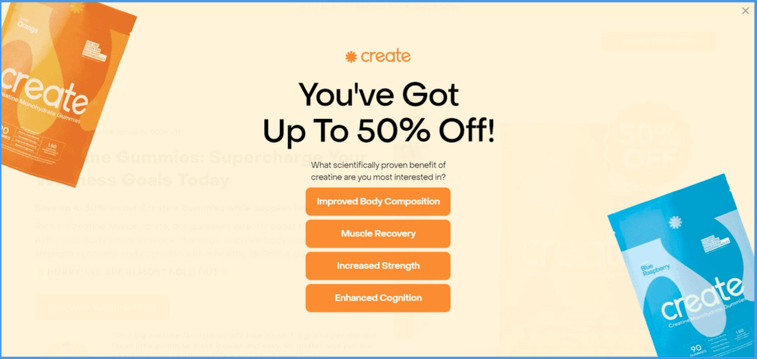 Create, a creatine gummy brand, uses the Alia popup to collect emails while highlighting their site-wide discount.