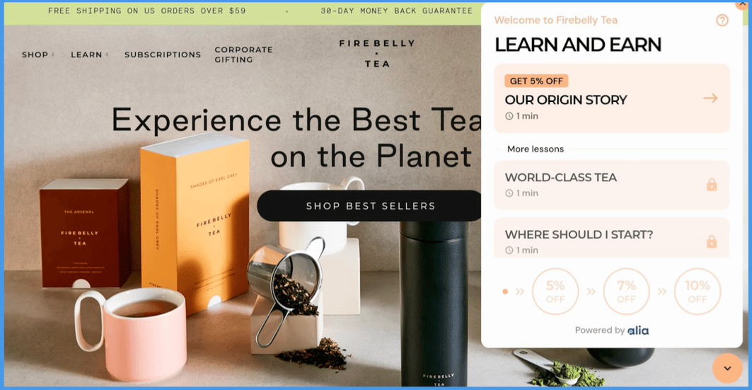 Firebelly Tea, a premier loose-leaf tea brand founded by Shopify President Harley Finkelstein, increased its email sign-up rate by 13% by gamifying the way customers learn about their brand. Not just that, they have a 30% conversion rate for visitors who engage with the popup on their homepage created with Alia.
